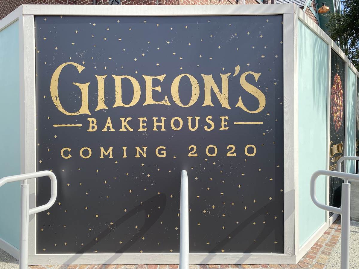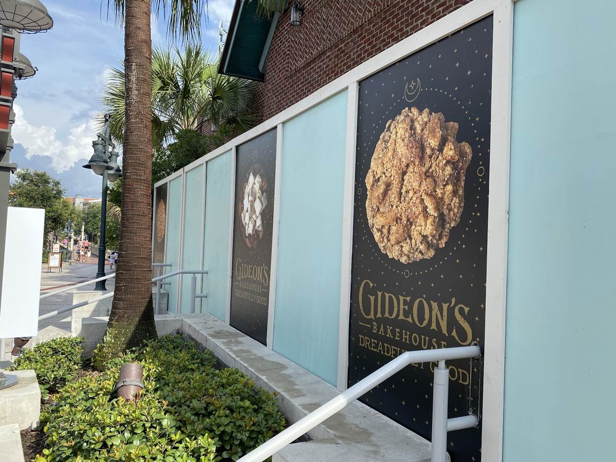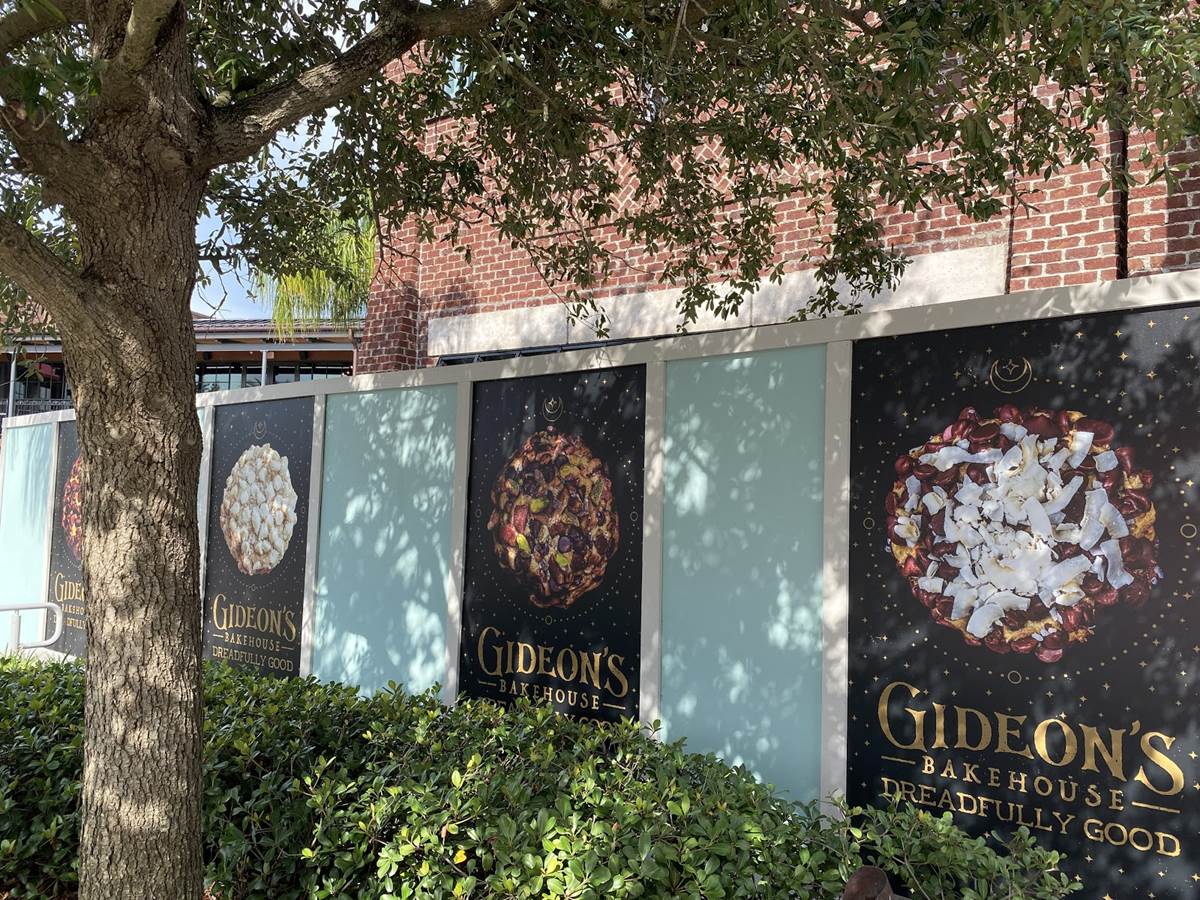 Announced just last month, construction walls have gone up for Gideon’s Bakehouse, a new experience coming to The Landing at Disney Springs.
