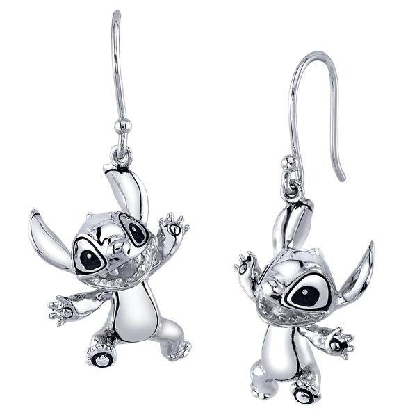 “Carved sterling silver, Stitch is sculpted in life-like detail, capturing his mischievous smile! Antiqued for emphasis, the three-dimensional earrings hang from nickel-free sterling silver french hook ear wires and are comfortably lightweight for everyday wear.”