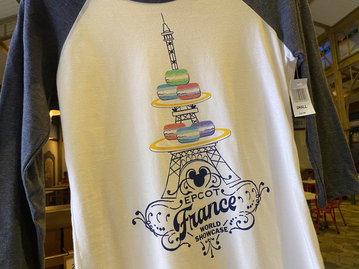 What goes great with Macaron Mouse Ears? How about a macaron Eiffel Tower long-sleeve shirt where the delectable cookies appear on serving trays at two levels of the famous Paris icon. This shirt retails for $39.99.