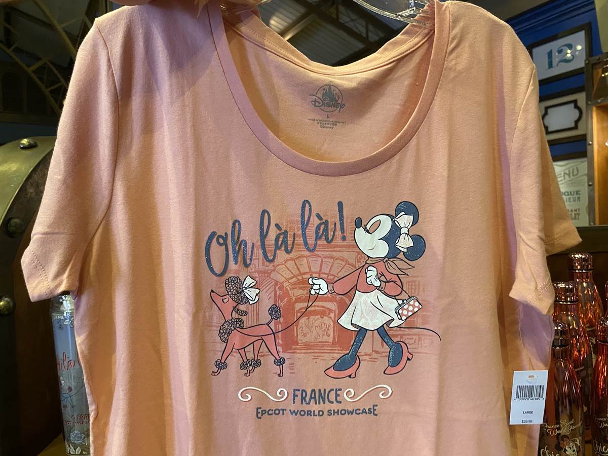 Not that into Spirit Jerseys? No worries, you can still look fabulous in this classic t-shirt that shows Minnie walking a poodle which also says “Oh la la!” This shirt retails for $29.99.