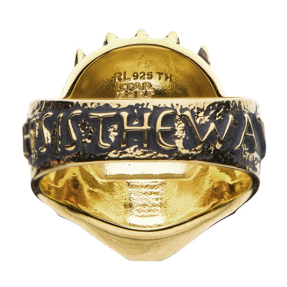 - Cimino: “The Armorer is a badass female leader who wields hammers and smelts metal. I’ve never related to a character more! This ring was a joy to create. We worked very hard perfecting the sculpt to look as much like the helmet as possible. To include the quote was definitely a no brainer,” Cimino says. “However, the inspiration came from the character herself rather than the creed. The Armorer never removes her helmet. Her success is not influenced by beauty, but purely based on merit: her strength, leadership, and hard work.”