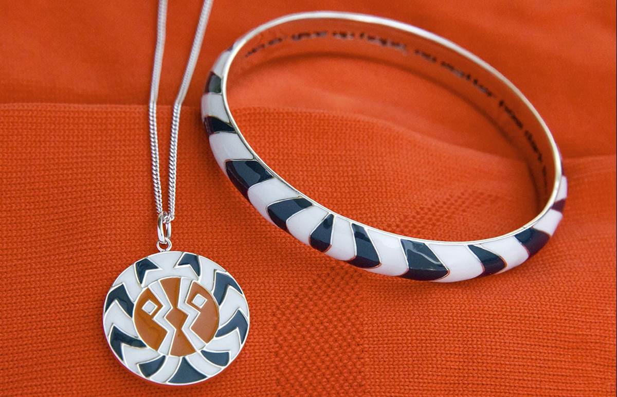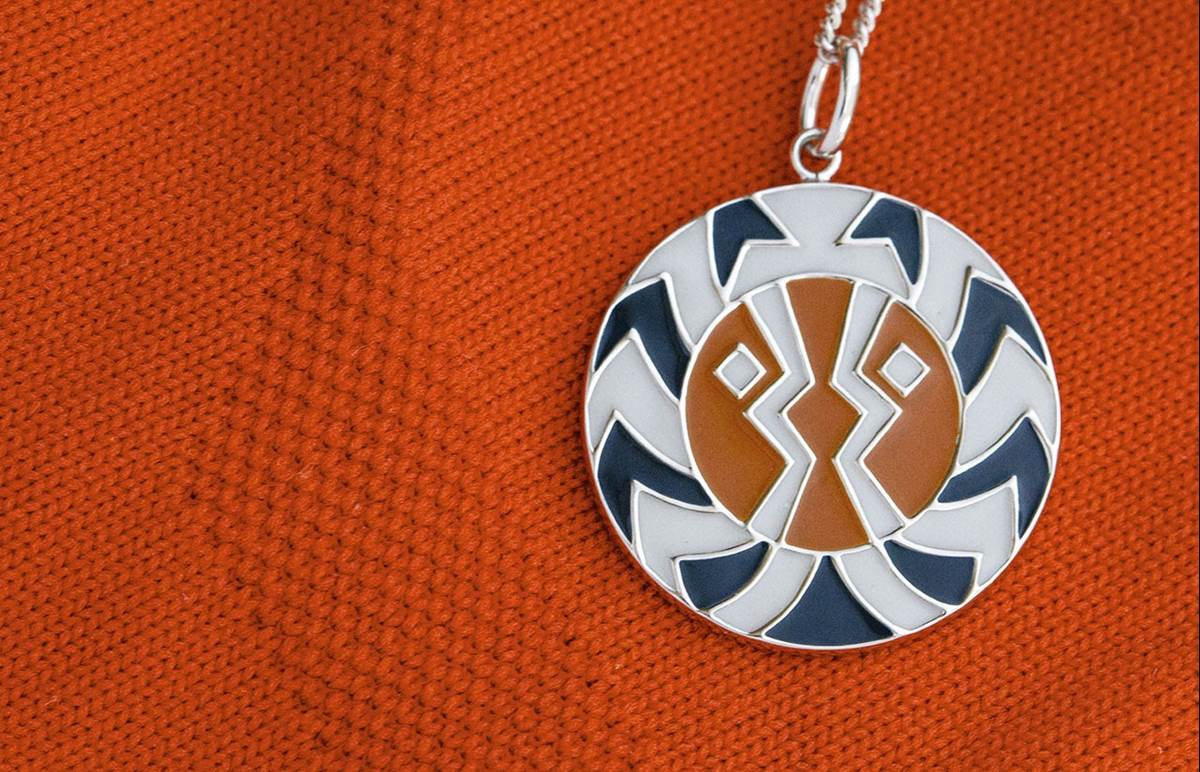 - The second piece is a modern art-inspired medallion handcrafted in solid sterling silver and then filled with vibrant grey-blue, orange, and white hand-painted premium enamel.