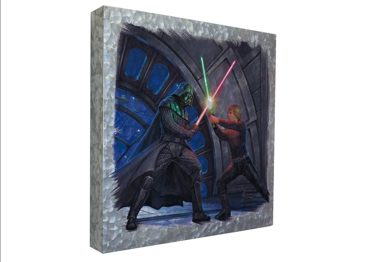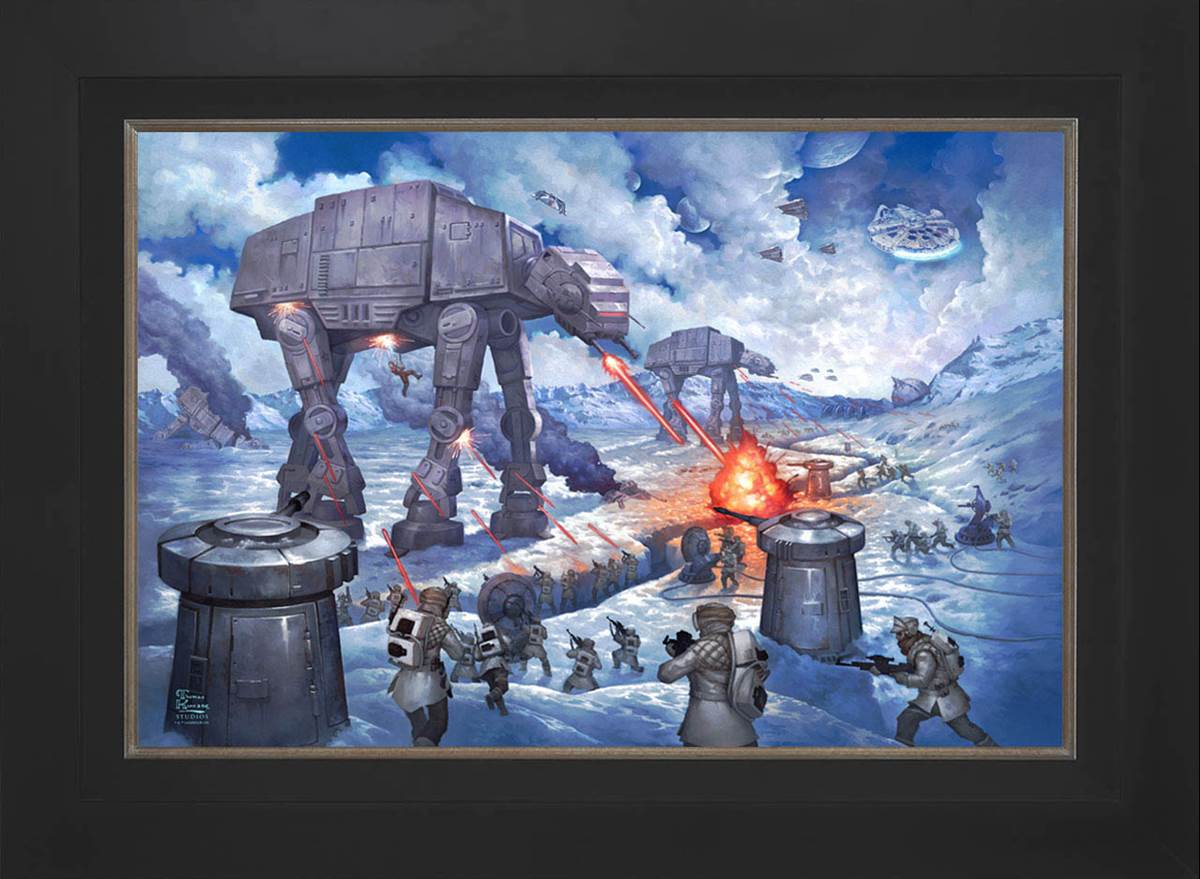 Thomas Kinkade Galleries have two prints, A Son’s Destiny and The Battle of Hoth, and vary in size.