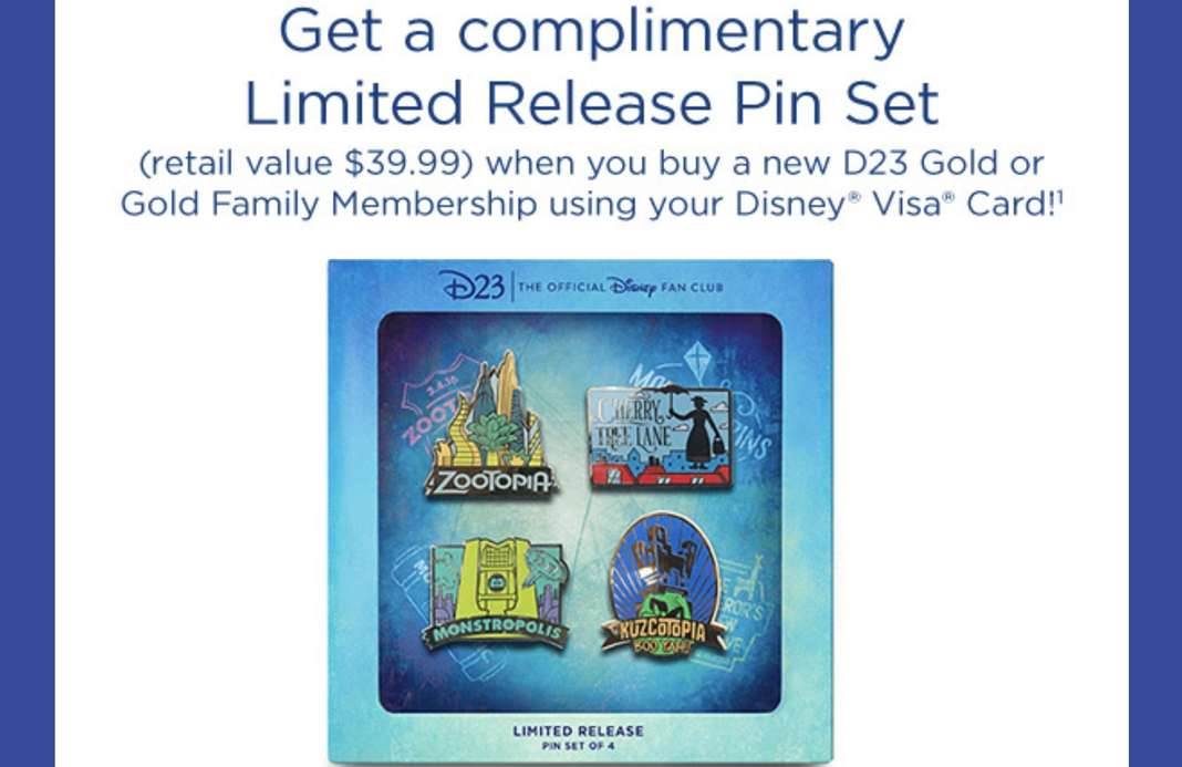 - Disney Visa Cardholders can get a free limited edition D23 Fantastic Worlds pin set when they sign up for a D23 Gold or Gold Family Membership before October 31st, 2020.