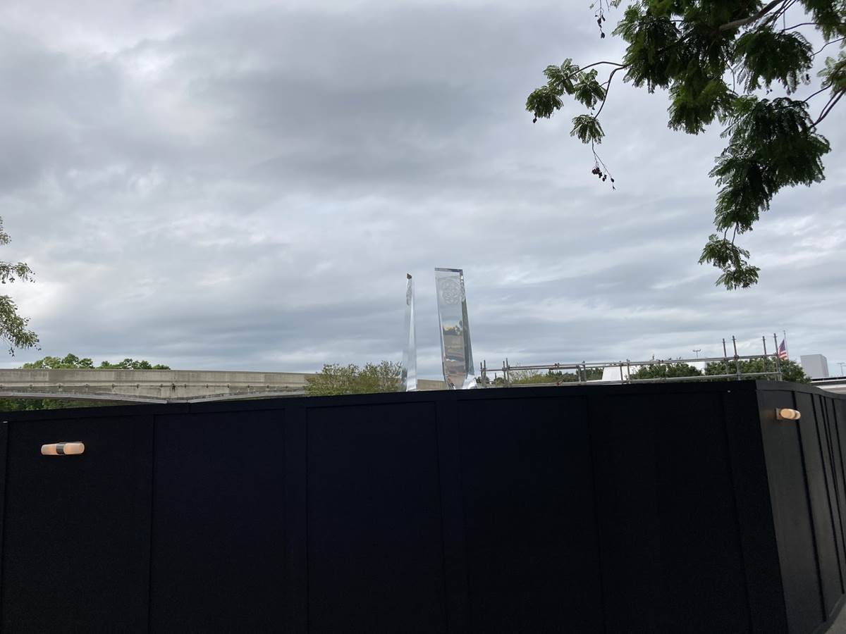 As we enter the park, we are greeted by walls just under Spaceship Earth but marking the return of the glass pylons that were once the centerpiece of the park’s entrance plaza fountain being restored to their former glory. The park logo, which symbolizes unity, fellowship, and harmony around the world with five outer rings that are linked to form the shape of a flower – a celebration of life - with the heart of the logo as the Earth, embraced by a star symbolizing hope – the hope that with imagination, commitment, and dedication, we can create a better tomorrow, is engraved into the pylons.
