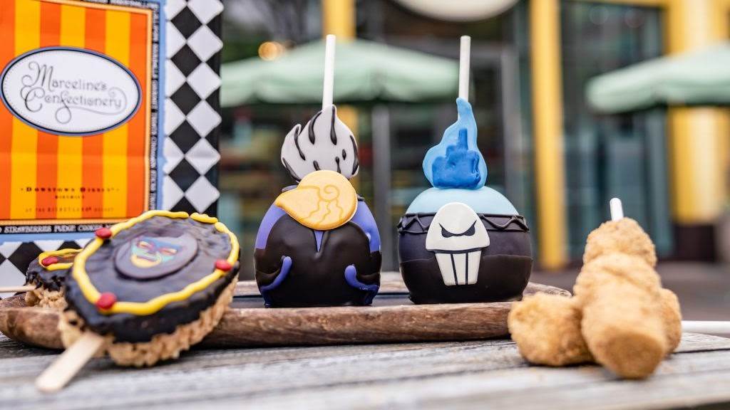 - Minnie Witch Candy Apple – Granny Smith apple dipped in caramel with marshmallow ears, enrobed in milk chocolate, and decorated with a chocolate witch hat, lavender-colored sugar, and orange candy-coated chocolates