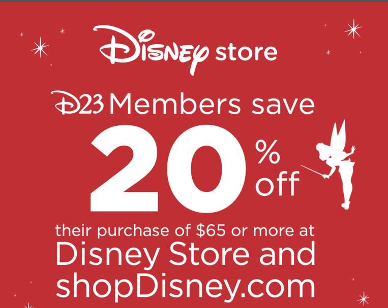 - D23 Members can save 20% off shopDisney orders of $65 or more between now and October 31st.