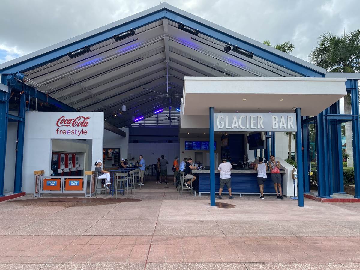 The Glacier Bar is a brand new offering at SeaWorld Orlando, occupying an area that was used as overflow queue space for the Wild Arctic simulator attraction. The attraction has not been open since the park reopened after being closed due to COVID-19 earlier this year, though the animal exhibit portion of the attraction is still open and accessible.
