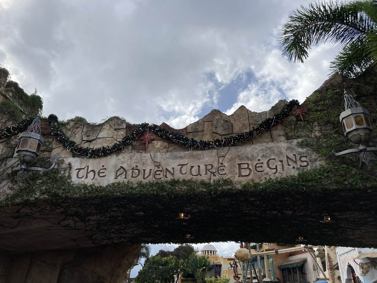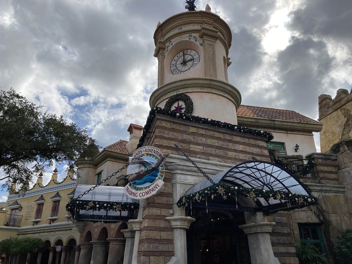 While the holiday decorating doesn’t yet appear to be fully complete just yet, there is already a whole lot of holiday cheer spread throughout the parks at this time. That includes Port of Entry, as holiday garland and other decor welcomes guests to the park.