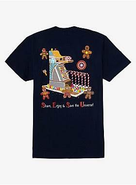 Avengers Assemble—literally! Our heroes’ headquarters are delightfully replicated out of gingerbread, candy canes, and icing on this fun shirt