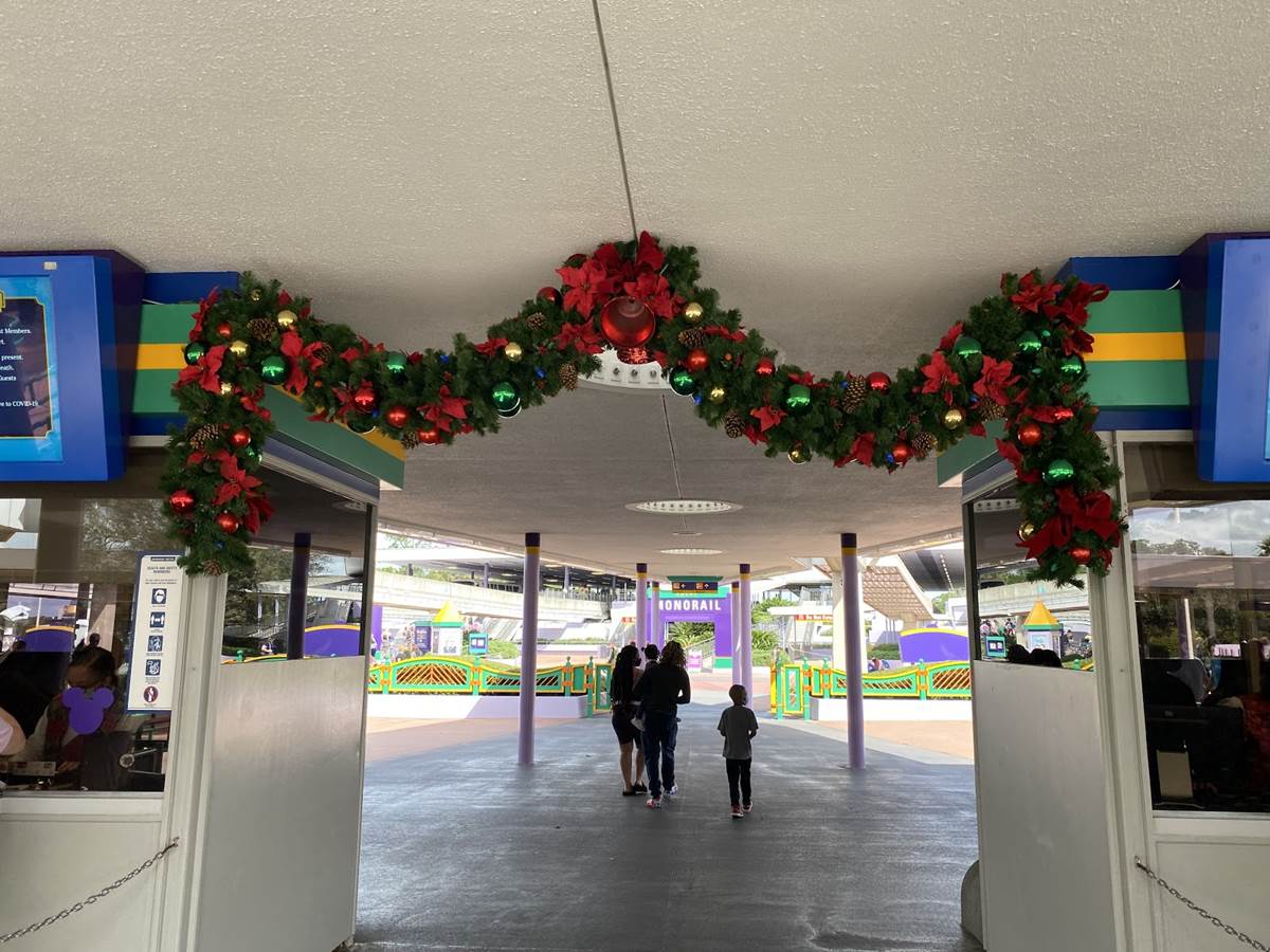 - Before guests even get to Magic Kingdom, they are greeted by some holiday garland and decor at the Transportation and Ticket Center.