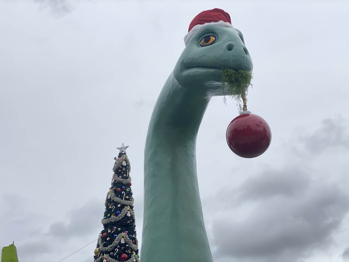 Gertie the dinosaur is in on the festive fun with a Santa hat and a giant ornament hanging out of her mouth with the seaweed she just pulled out of the lake.