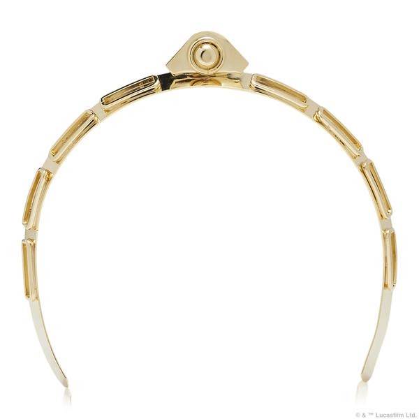 “The mechanics of C-3PO inspired a tiara-like headband. Hand crafted in NYC, each piece is created using 14 karat gold plated metal. Luxurious, sleek, and modern, the Tiara Threepio highlights the molded elements of his robotic features.”