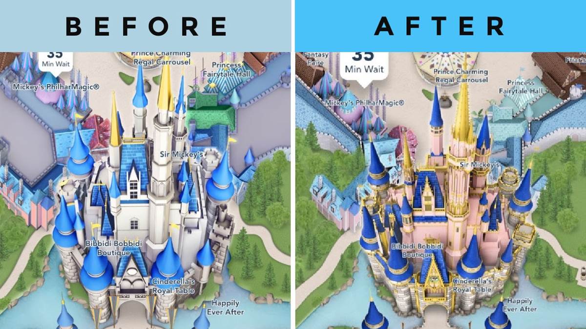 The latest app update to My Disney Experience highlights a few changes in and around Magic Kingdom. If you update your app and take a look, the first thing you’ll likely see is that the colors of Cinderella Castle now reflect the new paint job. You can see for yourself in our before and after photo.