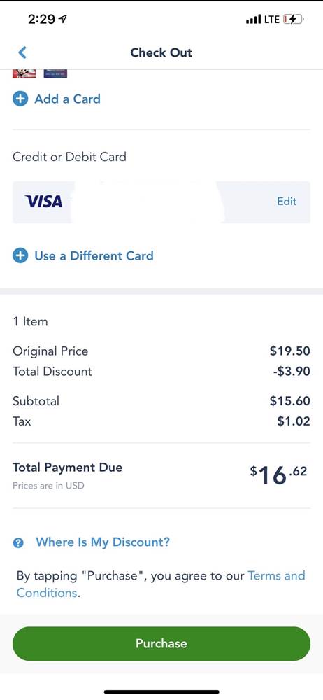 - After a guest completes their shopping trip, they can check out on the app with a linked form of payment, such as a credit or debit card. The app should also support Disney or other (Visa) Gift Cards for payment.