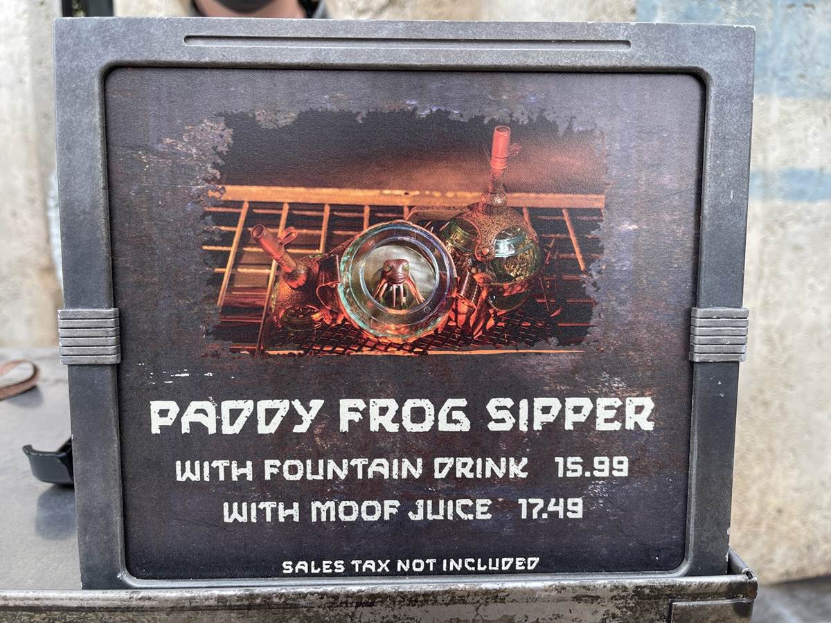 A cart outside Docking Bay 7 promotes the new souvenir sipper, officially called the “Paddy Frog Sipper,” so you can add it to your mobile food order if you’d like to bring one home.