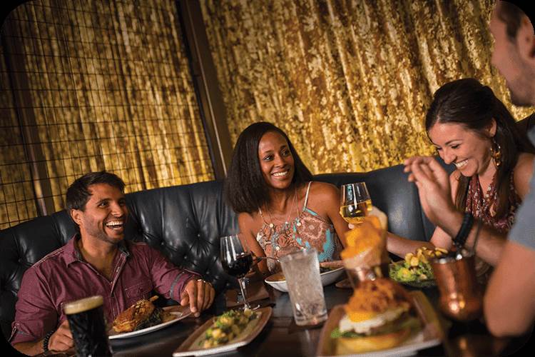 - NBC Sports Grill & Brew: Lobster Corn Dogs, Surf & Turf Wagyu Burger, and Praline Chocolate Crunch Cake.