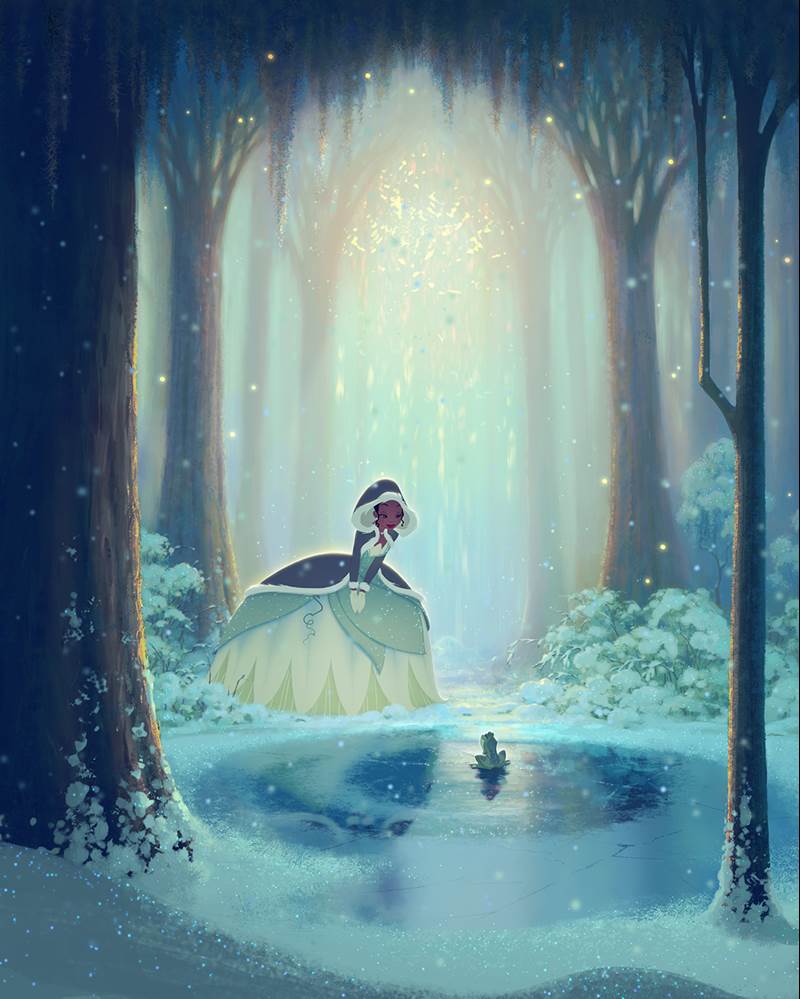 Tiana stands next to a frozen pond in Mama Odie’s magical section of the bayou where Prince Naveen awaits his enchanted kiss in a wintery version of one of the most magical moments from The Princess and the Frog. Ian Gooding was an art director on the film and also lent his talents to Aladdin, Pocahontas, Mulan and Tarzan.