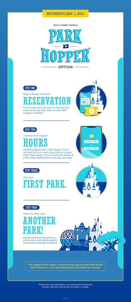 - Guests will need to make a Park Pass reservation for the first park they wish to visit that day. Once they have visited that first park, the ability to park hop will be allowed. No reservation will be needed for the second park visited, but it must be done after 2:00 p.m. ET.