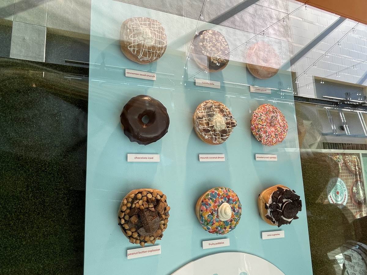 Many of the donuts are decorated with classic candy and cereals. Peanut Butter Explosion includes halved peanut butter cups on top.