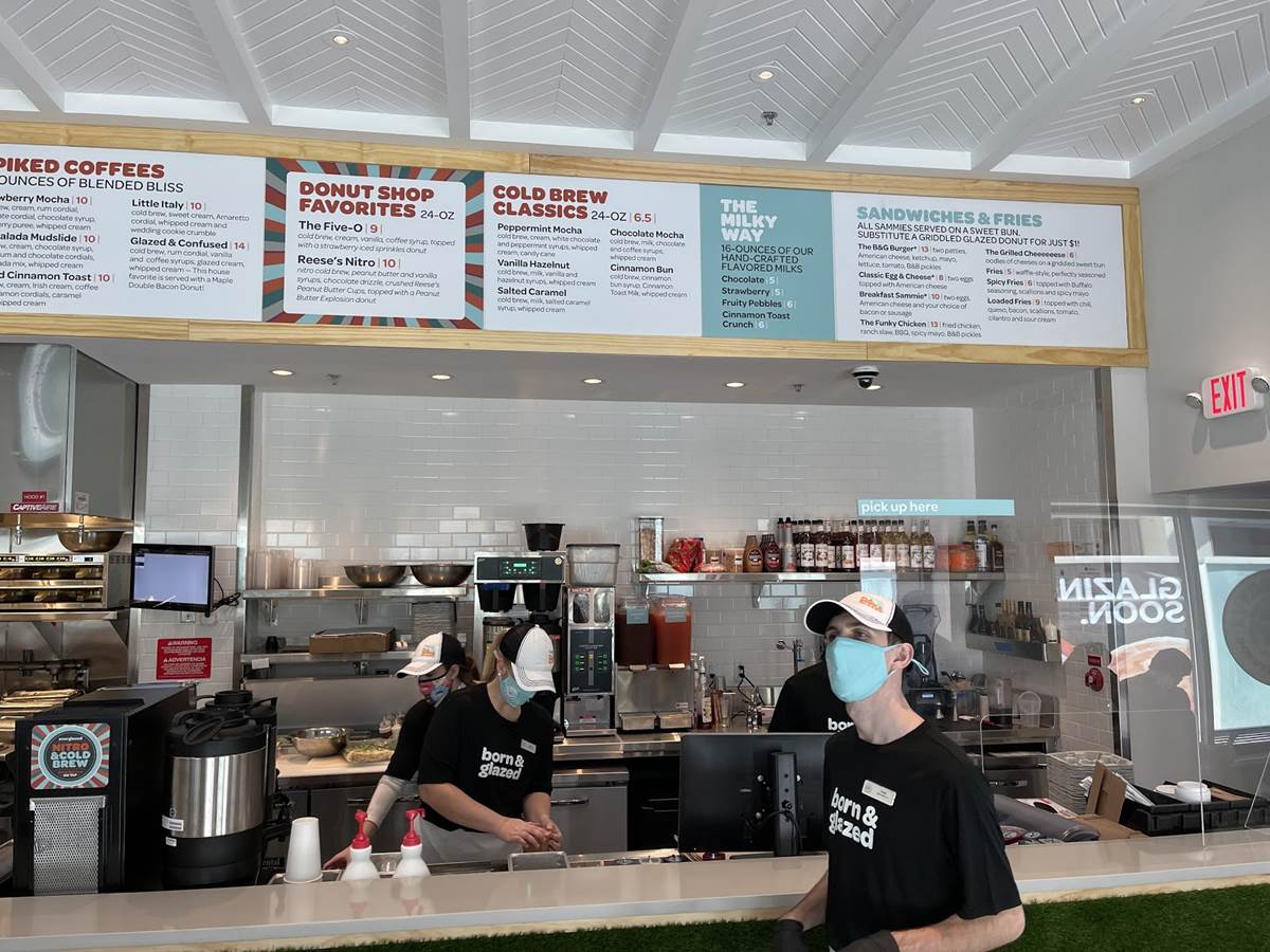 The L-Shaped counter makes it easy to see the menus for both the donuts and cold brew coffee beverages.