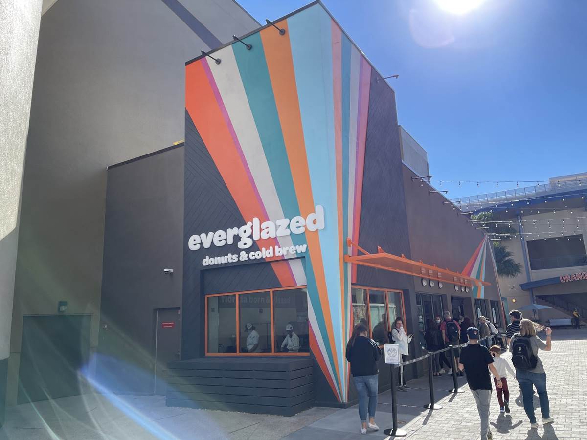Everglazed Donuts & Cold Brew opened their doors to Guests today at Disney Springs in the West Side, formerly the home of the Pop! Gallery art shop. As you walk between AMC 24 and Splitsville Luxury Lanes, you can’t miss the colorful new exterior on your way to the Orange parking garage.