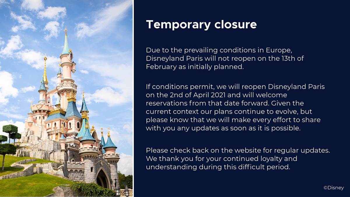 Disneyland Paris has announced that the initial plan to reopen on February 13 has now been delayed till April 2 due to the prevailing conditions in Europe.