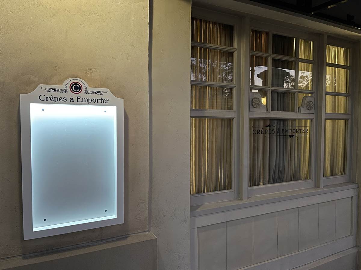 - Guests can also see the sign and window for Crepes a Emporter, a new crepe restaurant coming to the park.