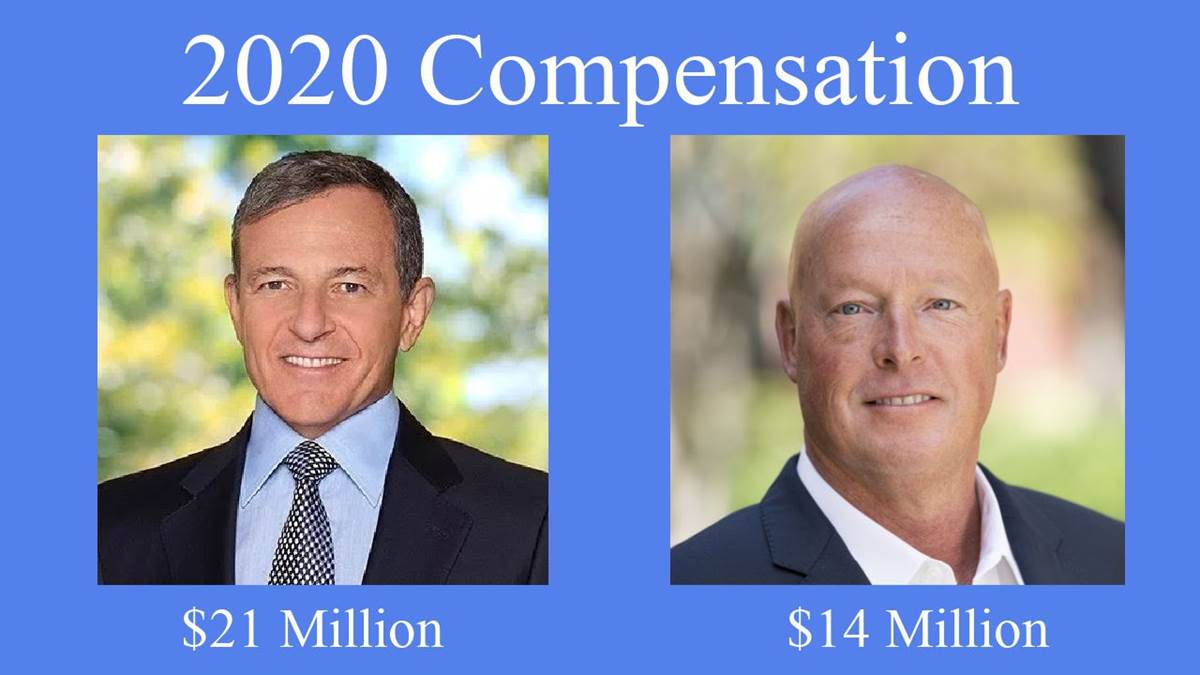 In Disney’s most recent Proxy statement, Bob Iger’s and Bob Chapek’s compensation for 2020 was disclosed. Bob Iger’s salary decreased from $3,000,000 to $1,569,581. He was awarded stock and options awards as well. His total compensation was $21,031,389 which is down from $47,517,762.