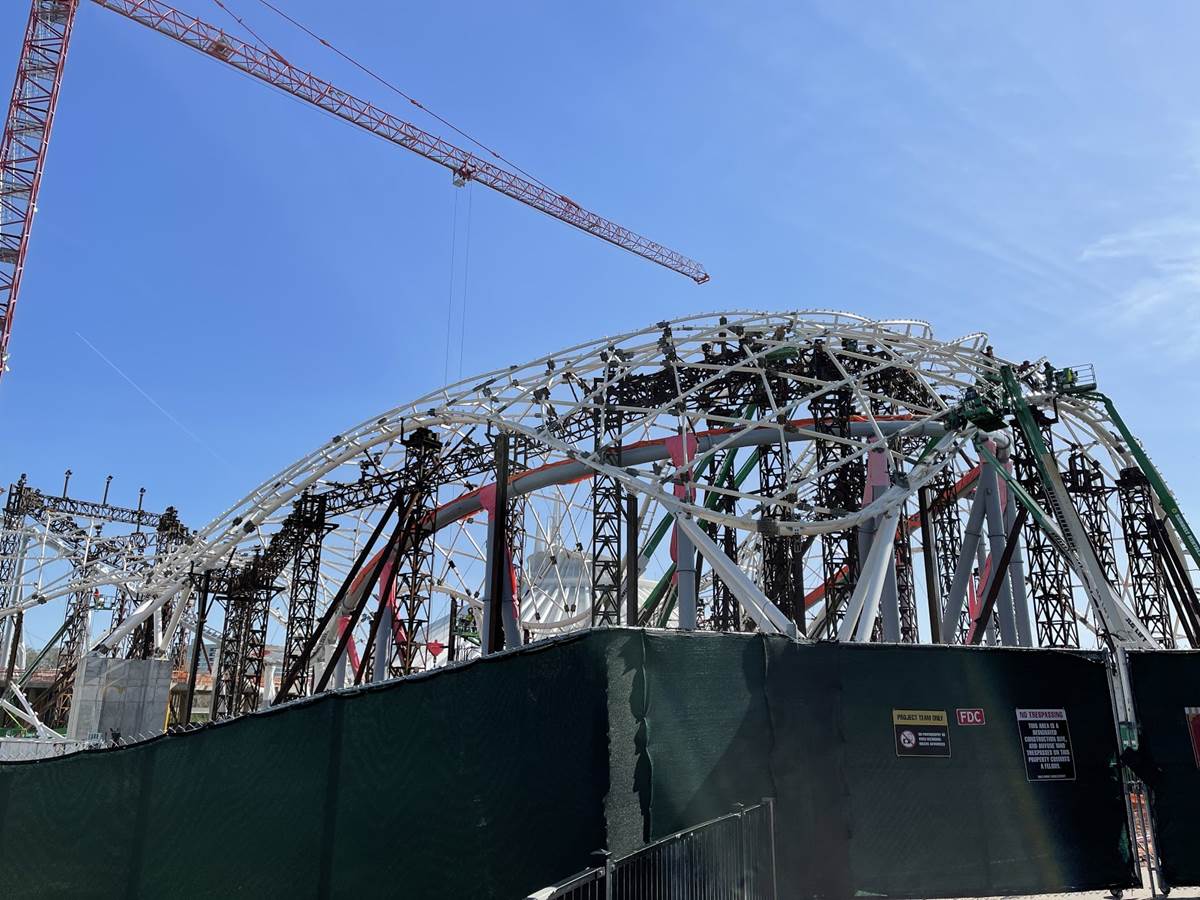 - As we look at the progress from this vantage point you can see that more of the canopy that will cover the exterior track is taking shape. New structure and pylons that almost look like additional coaster tracks are actually for this canopy.
