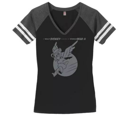 This varsity style v-neck shirt features an exclusive design concept art of Fifinella, created by Roald Dahl and The Walt Disney Studios and used as an insignia by The Women’s Air Force Pilots, printed in gunmetal grey.