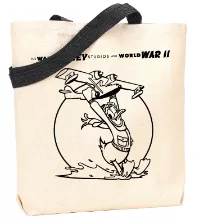 This tote bag features the museum’s exclusive insignia design of Donald Duck dressed as a pilot, holding onto the wings of a Consolidated PBY Catalina flying boat while soaring through the air. The back side of the tote features the museum logo.
