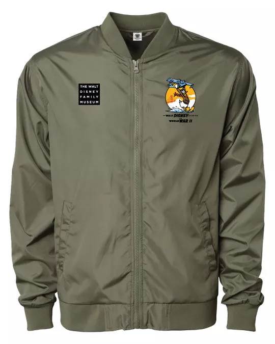 This bomber-style windbreaker features the museum’s exclusive insignia design of Donald Duck clad in pilot gear, holding onto the wings of a Consolidated PBY Catalina flying boat while soaring over the Golden Gate Bridge. This boat was commonly seen in the San Francisco Bay during World War II. The insignia is in multicolor embroidery with the exhibition title logo.