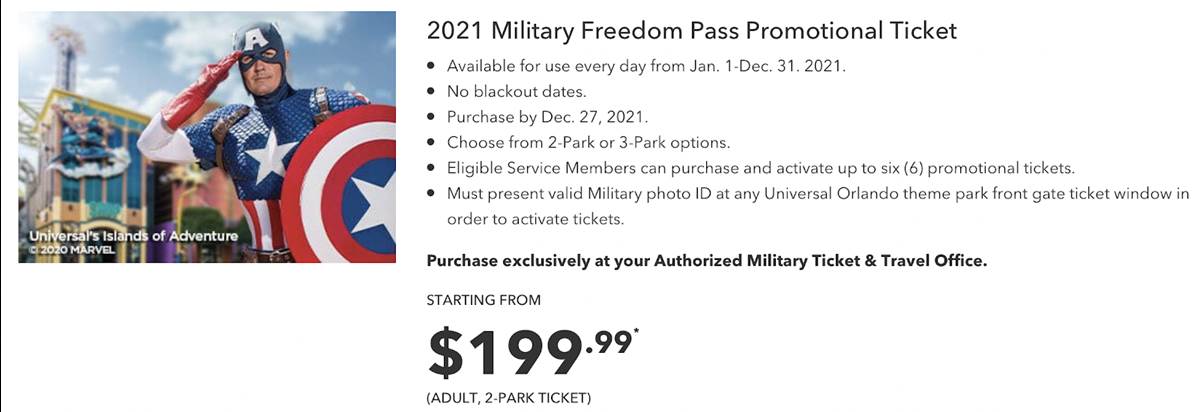 - There are two options for the pass, a 2-Park 2021 Military Freedom Pass for $199.99 per adult or a 3-Park pass for $234.99 per adult. The 3-Park pass can be used at Universal’s Volcano Bay once it reopens on March 1.
