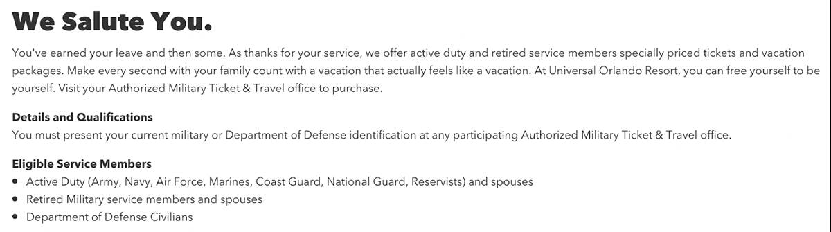 - Military members can also take advantage of exclusive vacation package upgrades with the “Military Create Your Own Vacation Package” and “The Wizarding World of Harry Potter Exclusive Military Vacation Package,” as well as up to 40% off hotel stays.