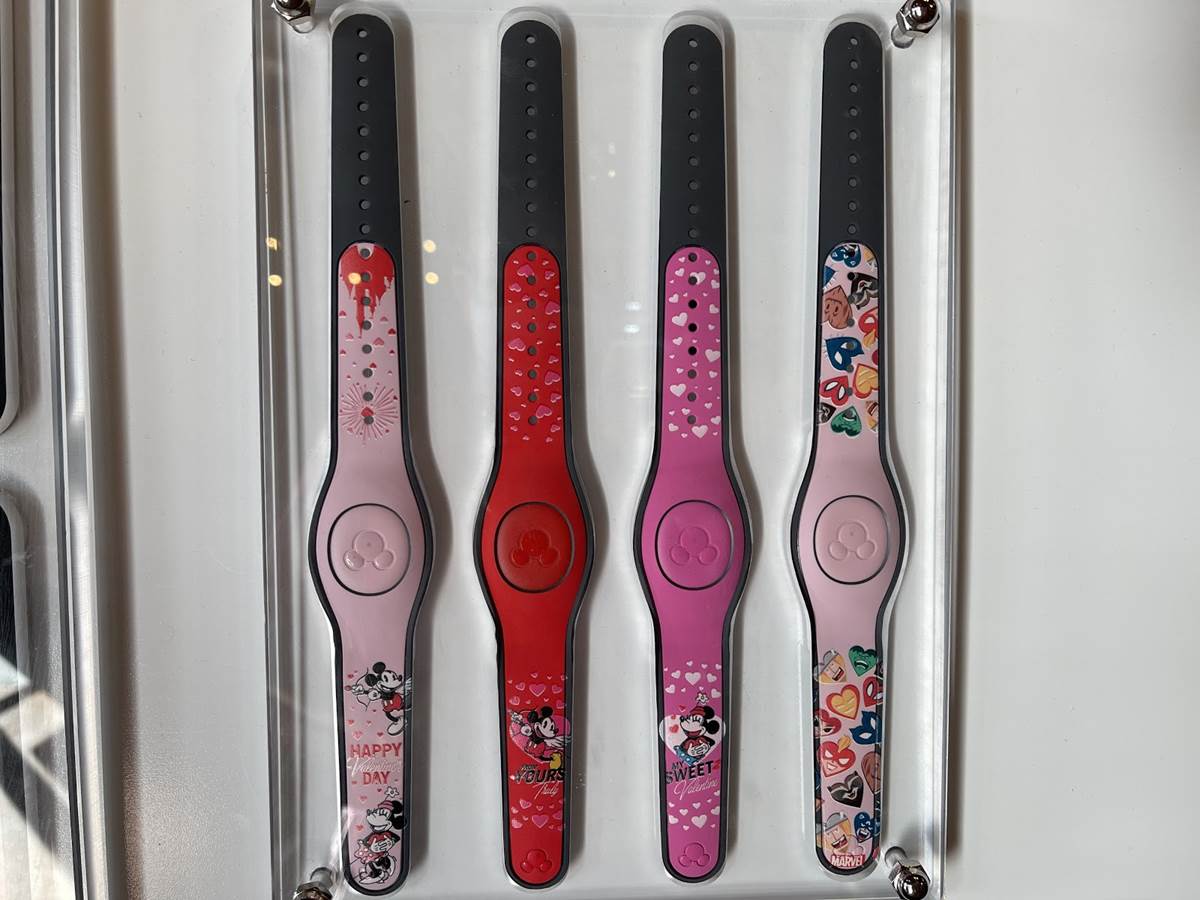 Using some of the same artwork, MagicBands include a couple’s Mickey and Minnie band and the Marvel Valentine candy hearts option.