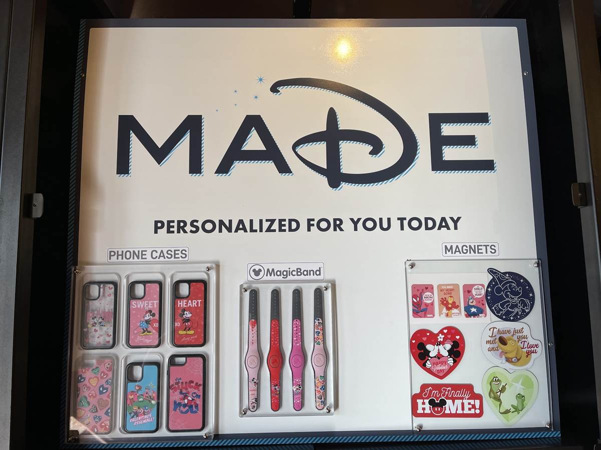 Inside the Marketplace Co-Op, MADE (previously known as D-Tech On Demand) offers customizable phone cases, MagicBands and magnets. Six new styles of phone cases arrived just in time for Valentine’s Day, including a 3D Mickey and Minnie case and three featuring Marvel superheroes.