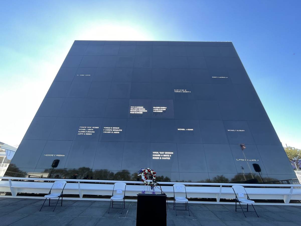 - The bulk of the ceremony took place at the Space Mirror Memorial at the complex. NASA’s fallen heroes are honored at this monument to commemorate astronauts who gave their lives in pursuit of knowledge that lies beyond Earth. Along with the 7 who were aboard the STS-51L Challenger mission, this highly polished black granite is emblazoned with the names of 24 astronauts total, also including the crews of Apollo 1, and STS-107 Columbia. Dedicated in 1991, and created by the Astronauts Memorial Foundation, the Space Mirror Memorial is designated as a national memorial on the National Register of Historic Places. Constantly illuminated, the astronaut names on this memorial are a simple reminder that space exploration can require the ultimate sacrifice.