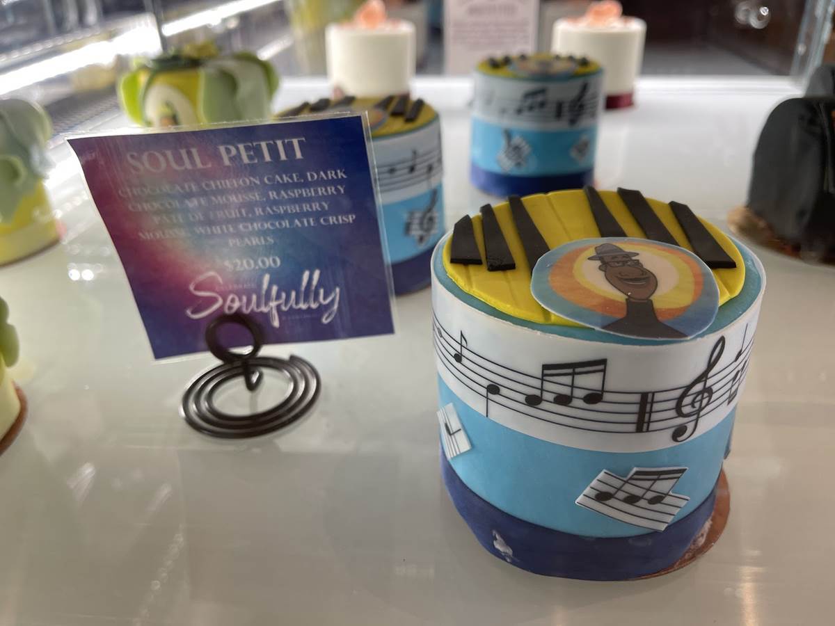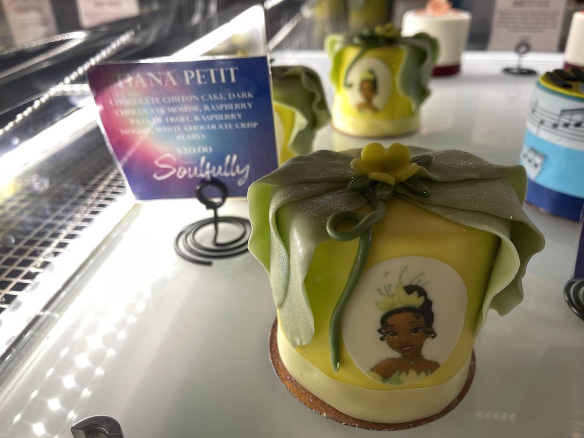 Over at Amorette's Patisserie near World of Disney, you can pick up this Soul petit cake and one inspired by Tiana from the movie The Princess and the Frog.