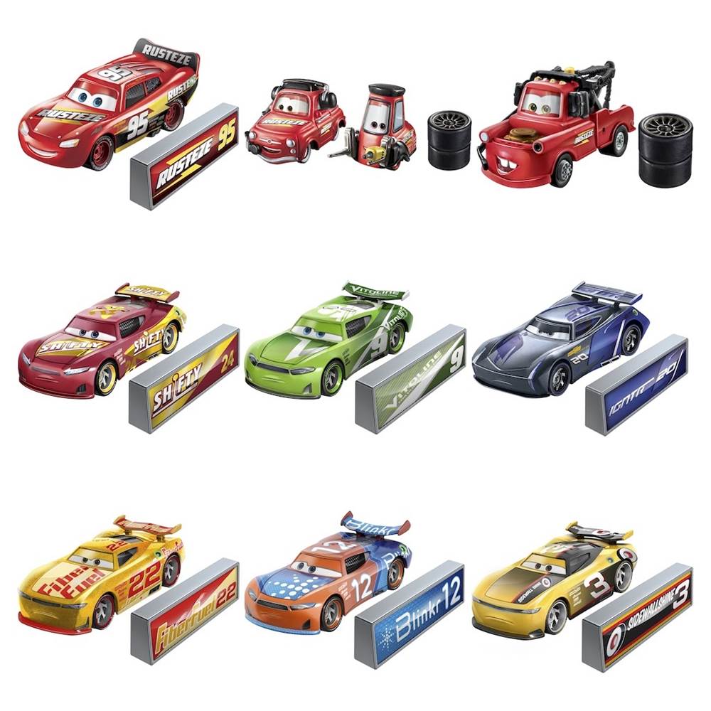 These 1:55-scale singles are available now and feature core characters like Lightning McQueen, Jackson Storm, Mater, Luigi and Guido with special NASCAR-inspired designs.