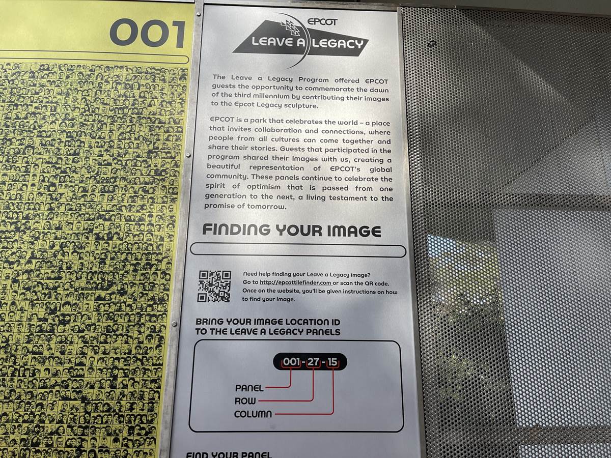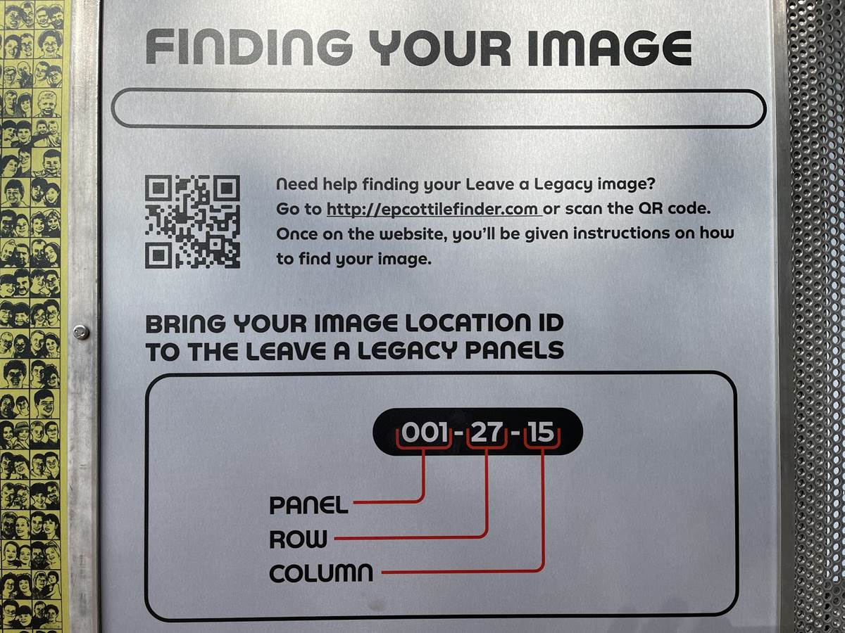 - For anyone who wants to search for a tile at the new location, guests can use their smart device to scan the QR code at the Leave a Legacy display. This opens up the tile finder search feature, which can provide the coordinates for a tile’s location. Guests can also visit the EPCOT Guest Relations team for assistance.