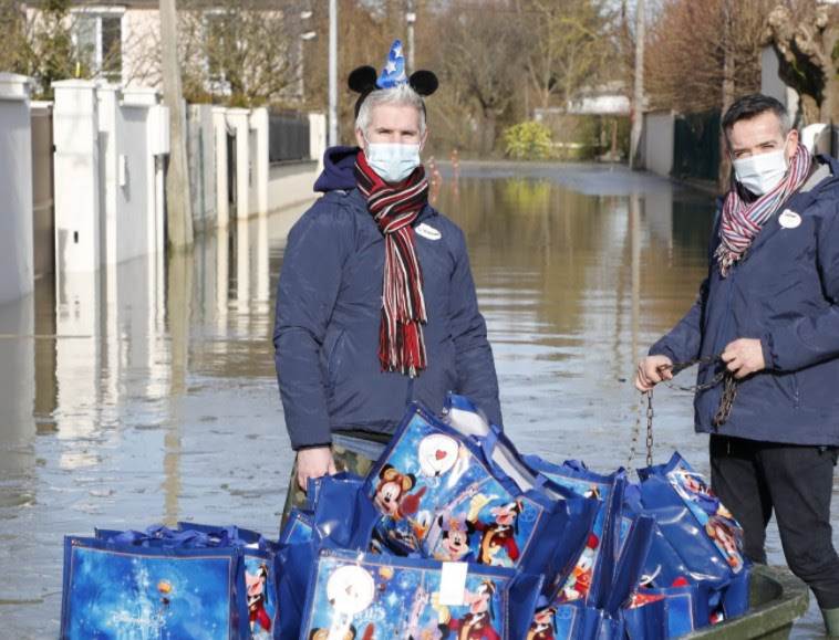 - Despite the cold on Saturday, February 13, a dozen Disney VoluntEARS – the employee-volunteers of Disneyland Paris who give their free time for helping those who need it the most – walked through high water delivering gift baskets to flood victims in the town of Esbly. Accompanied by teams from town hall, they distributed 300 gift baskets of snacks and drinks.