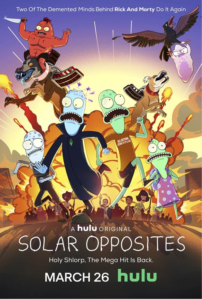 - “Co-created by Justin Roiland (Rick & Morty) and Mike McMahan (ex-writer's assistant on Rick & Morty), Solar Opposites centers around a team of four aliens who escape their exploding home world only to crash land into a move-in ready home in suburban America. They are evenly split on whether Earth is awful or awesome. Korvo (Justin Roiland) and Yumyulack (Sean Giambrone) only see the pollution, crass consumerism, and human frailty while Terry (Thomas Middleditch) and Jesse (Mary Mack) love humans and all their TV, junk food and fun stuff. Their mission: protect the Pupa, a living super computer that will one day evolve into its true form, consume them and terraform the Earth. On season two of Solar Opposites, the Solar Opposites take it bigger, funnier, and more opposite than ever before.”