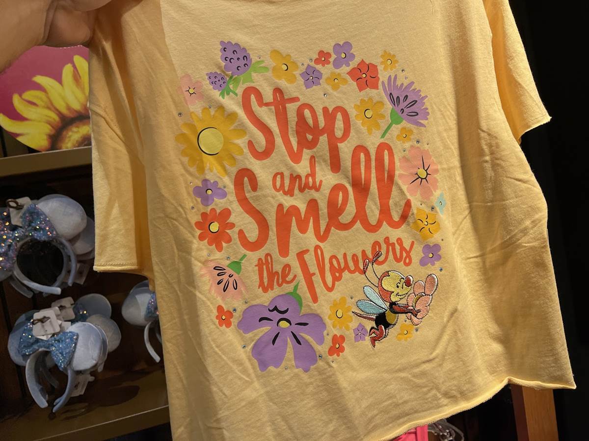 - This tee features Spike the Bee enjoying the sights and smells of spring along with the phrase “Stop and smell the flowers.”