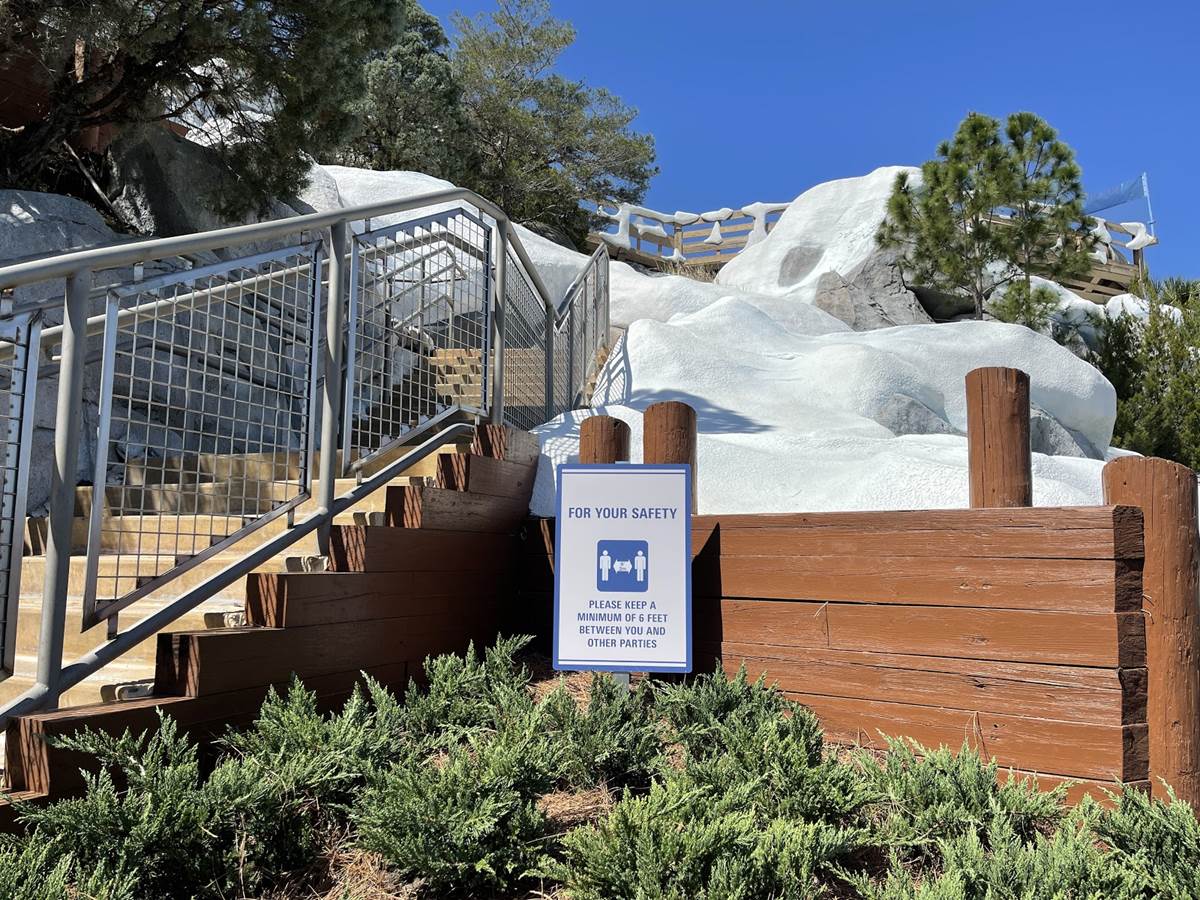 The need for social distancing precautions may not have been needed TODAY but they will be needed in the coming days, weeks, and months, with Spring Break just around the corner and the blistering heat of the summer months ahead with guests ready to hit the fake icy slopes to beat the heat, and with no date for Disney’s Typhoon Lagoon announced yet either, Blizzard Beach remains the only water park option for Walt Disney World guests. Signage, Queue Markers, and other efforts similar to those we’ve already seen in the theme parks are in place. Blizzard Beach’s Chairlift, taking guests to the top of Mt. Gushmore where many slides begin is also operating, though without the single rider line.