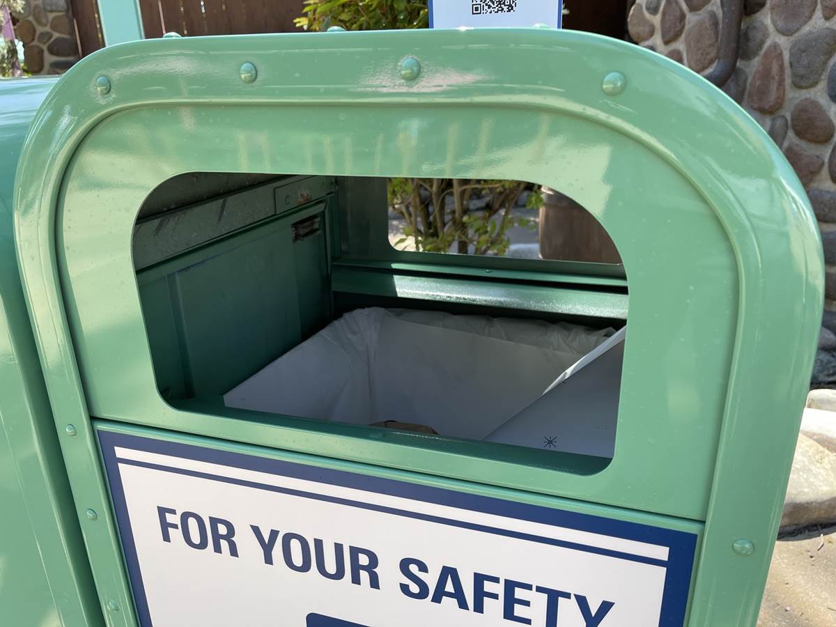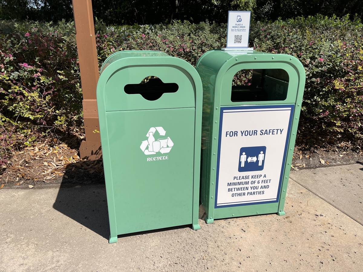 - The new trash cans we’ve spotted today have no hinged door whatsoever, and are just a large opening for guests to toss their trash.