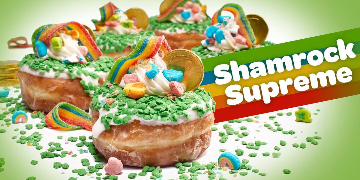 - The Shamrock Supreme Donut is a glazed donut vanilla iced and then dipped in green shamrocks and topped with Lucky Charm marshmallows, Sour Patch crumbles, a gummy rainbow strip, vanilla buttercream, and a chocolate gold coin.
