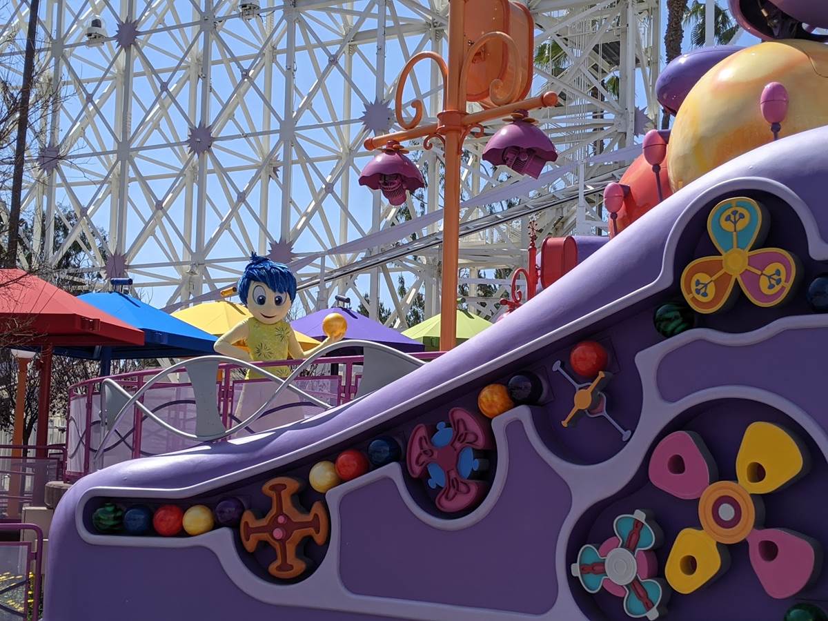 Characters are also popping up all around the park. We were able to spot Joy playing with a core memory (we know it’s a core memory, we asked!) at the Inside Out Emotional Whirlwind.