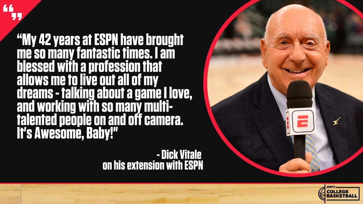 - Dick Vitale on the extension: “My 42 years at ESPN have brought me so many fantastic times. I am blessed with a profession that allows me to live out all of my dreams — talking about a game I love, and working with so many multi-talented people on and off camera. It’s awesome baby!”