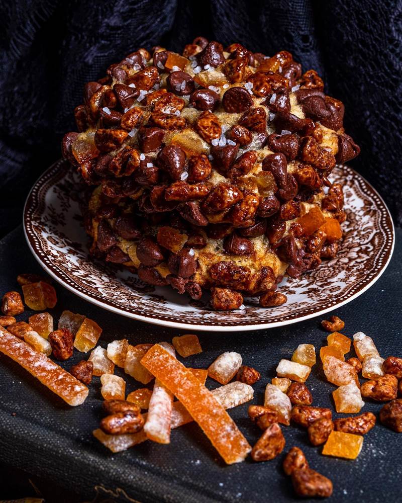 - The cookie is vanilla bean cookie dough fused with orange and mixed with Gideon’s dark chocolates. Pecan pralines cover the exterior.